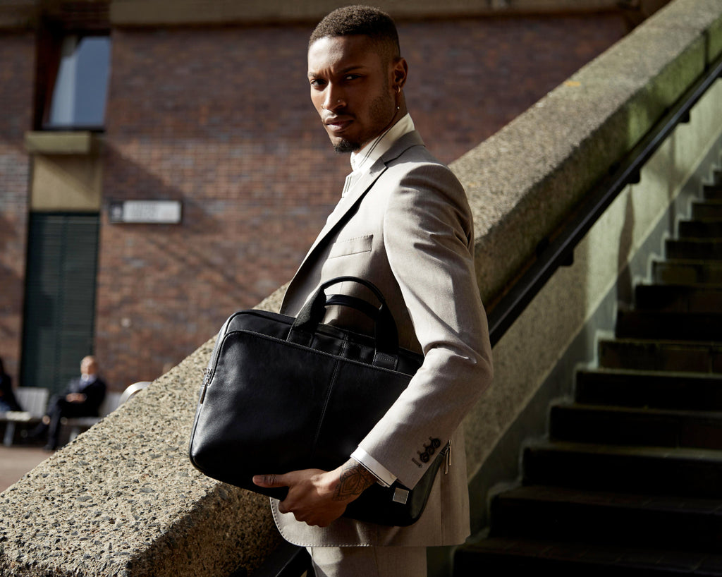 Our Amesbury bag is aimed at the business-minded man who is constantly on the go. This full grain leather briefcase provides you with two main compartments to pack those important files for that upcoming business trip. The zipped RFID pocket protects your passports and contactless cards, while the back pocket can store your laptop up to 15”. The trolley sleeve is concealed with a zip for a clean professional aesthetic.