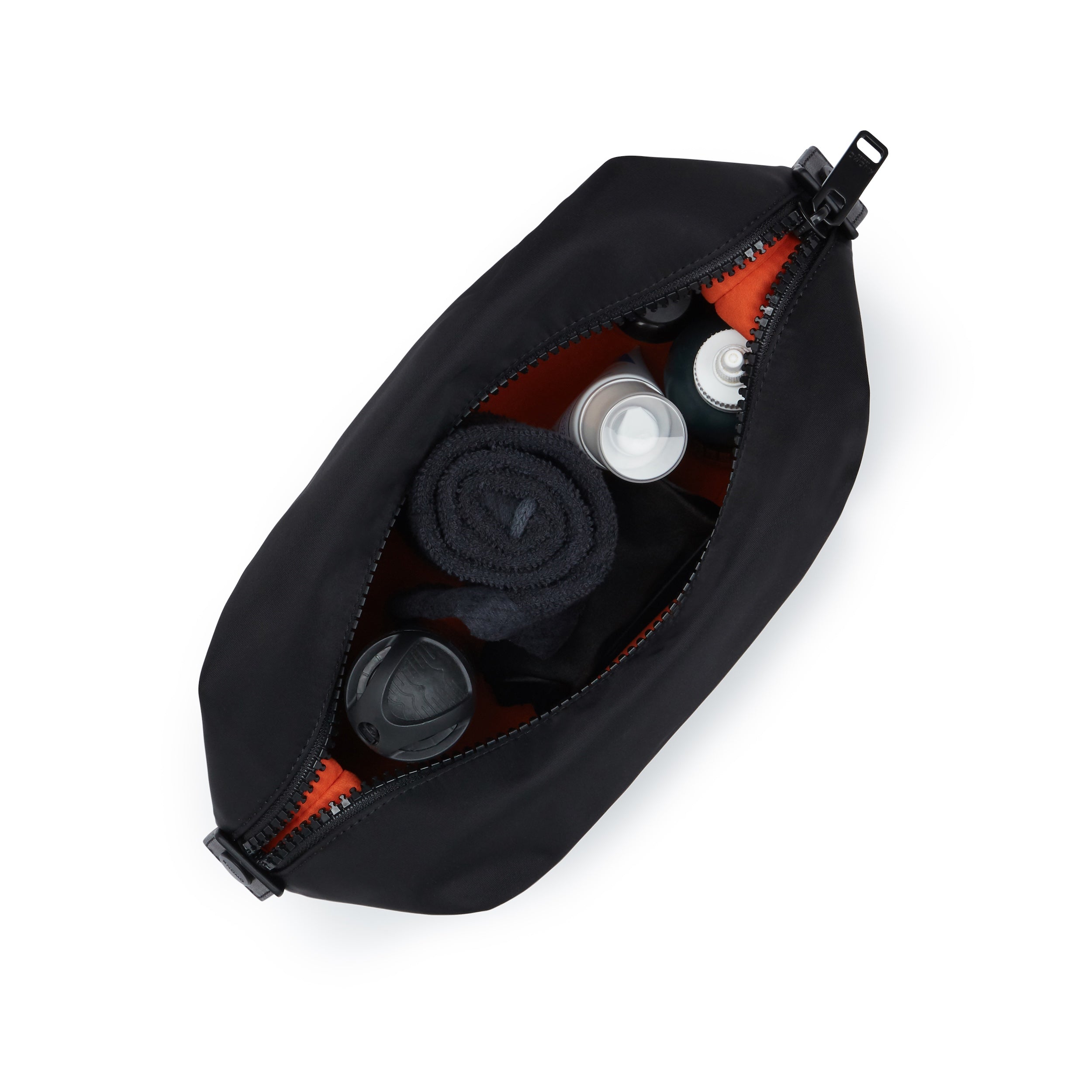 - Made with durable econyl nylon, accented with leather trim and sleek black hardware